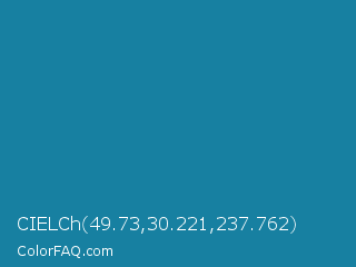 CIELCh 49.73,30.221,237.762 Color is a normal blue color and the nearest color is Jelly Bean #297b9a. Hex code #1780a1 and RGB value is rgb(23,128,161). In RGB color space, this color is composed of 9% red, 50% green, 63% blue, In CMYK color space, this color is composed of 86% cyan, 20% magenta, 0% yellow , 37% black , In HSL color space, this color has a hue angle of 194° , 75% saturation and 36% lightness.