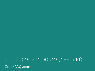 CIELCh 49.741,30.249,189.644 Color is a normal cyan color and the nearest color is Elm #1c7c7d. Hex code #18847e and RGB value is rgb(24,132,126). In RGB color space, this color is composed of 9% red, 52% green, 49% blue, In CMYK color space, this color is composed of 82% cyan, 0% magenta, 5% yellow , 48% black , In HSL color space, this color has a hue angle of 177° , 69% saturation and 31% lightness.