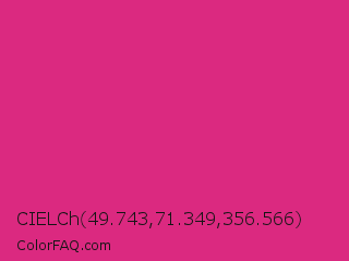 CIELCh 49.743,71.349,356.566 Color is a normal rose color and the nearest color is Cerise #da3287. Hex code #db2980 and RGB value is rgb(219,41,128). In RGB color space, this color is composed of 86% red, 16% green, 50% blue, In CMYK color space, this color is composed of 0% cyan, 81% magenta, 42% yellow , 14% black , In HSL color space, this color has a hue angle of 331° , 71% saturation and 51% lightness.