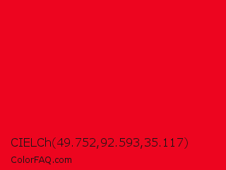 CIELCh 49.752,92.593,35.117 Color is a normal red color and the nearest color is Spanish Red #e60026. Hex code #ed051f and RGB value is rgb(237,5,31). In RGB color space, this color is composed of 93% red, 2% green, 12% blue, In CMYK color space, this color is composed of 0% cyan, 98% magenta, 87% yellow , 7% black , In HSL color space, this color has a hue angle of 353° , 96% saturation and 47% lightness.