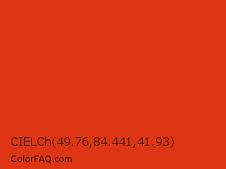 CIELCh 49.76,84.441,41.93 Color is a normal red color and the nearest color is Vermilion #d9381e. Hex code #de3614 and RGB value is rgb(222,54,20). In RGB color space, this color is composed of 87% red, 21% green, 8% blue, In CMYK color space, this color is composed of 0% cyan, 76% magenta, 91% yellow , 13% black , In HSL color space, this color has a hue angle of 10° , 83% saturation and 47% lightness.
