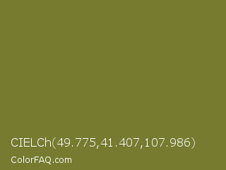CIELCh 49.775,41.407,107.986 Color is a normal yellow color and the nearest color is Pesto #7c7631. Hex code #767b30 and RGB value is rgb(118,123,48). In RGB color space, this color is composed of 46% red, 48% green, 19% blue, In CMYK color space, this color is composed of 4% cyan, 0% magenta, 61% yellow , 52% black , In HSL color space, this color has a hue angle of 64° , 44% saturation and 34% lightness.