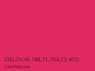 CIELCh 49.788,71.764,13.403 Color is a normal rose color and the nearest color is Cerise Red #de3163. Hex code #e0295e and RGB value is rgb(224,41,94). In RGB color space, this color is composed of 88% red, 16% green, 37% blue, In CMYK color space, this color is composed of 0% cyan, 82% magenta, 58% yellow , 12% black , In HSL color space, this color has a hue angle of 343° , 75% saturation and 52% lightness.