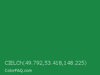 CIELCh 49.792,53.418,148.225 Color is a normal green color and the nearest color is Salem #097f4b. Hex code #1a8844 and RGB value is rgb(26,136,68). In RGB color space, this color is composed of 10% red, 53% green, 27% blue, In CMYK color space, this color is composed of 81% cyan, 0% magenta, 50% yellow , 47% black , In HSL color space, this color has a hue angle of 143° , 68% saturation and 32% lightness.