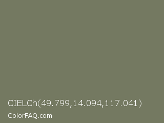 CIELCh 49.799,14.094,117.041 Color is a normal lime color and the nearest color is Limed Ash #747d63. Hex code #747961 and RGB value is rgb(116,121,97). In RGB color space, this color is composed of 45% red, 47% green, 38% blue, In CMYK color space, this color is composed of 4% cyan, 0% magenta, 20% yellow , 53% black , In HSL color space, this color has a hue angle of 73° , 11% saturation and 43% lightness.