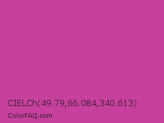 CIELCh 49.79,66.084,340.613 Color is a normal magenta color and the nearest color is Byzantine #bd33a4. Hex code #c7409d and RGB value is rgb(199,64,157). In RGB color space, this color is composed of 78% red, 25% green, 62% blue, In CMYK color space, this color is composed of 0% cyan, 68% magenta, 21% yellow , 22% black , In HSL color space, this color has a hue angle of 319° , 55% saturation and 52% lightness.