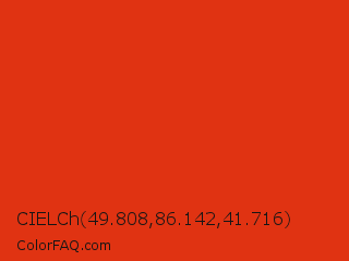CIELCh 49.808,86.142,41.716 Color is a normal red color and the nearest color is Vermilion #d9381e. Hex code #e03312 and RGB value is rgb(224,51,18). In RGB color space, this color is composed of 88% red, 20% green, 7% blue, In CMYK color space, this color is composed of 0% cyan, 77% magenta, 92% yellow , 12% black , In HSL color space, this color has a hue angle of 10° , 85% saturation and 47% lightness.