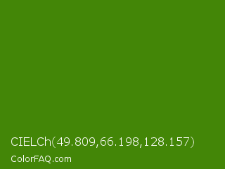 CIELCh 49.809,66.198,128.157 Color is a dark green color and the nearest color is Avocado #568203. Hex code #438607 and RGB value is rgb(67,134,7). In RGB color space, this color is composed of 26% red, 53% green, 3% blue, In CMYK color space, this color is composed of 50% cyan, 0% magenta, 95% yellow , 47% black , In HSL color space, this color has a hue angle of 92° , 90% saturation and 28% lightness.