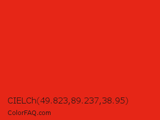 CIELCh 49.823,89.237,38.95 Color is a normal red color and the nearest color is Lust #e62020. Hex code #e62617 and RGB value is rgb(230,38,23). In RGB color space, this color is composed of 90% red, 15% green, 9% blue, In CMYK color space, this color is composed of 0% cyan, 83% magenta, 90% yellow , 10% black , In HSL color space, this color has a hue angle of 4° , 82% saturation and 50% lightness.