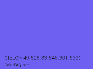 CIELCh 49.828,83.846,301.533 Color is a light indigo color and the nearest color is Medium Slate Blue #7b68ee. Hex code #6e61f2 and RGB value is rgb(110,97,242). In RGB color space, this color is composed of 43% red, 38% green, 95% blue, In CMYK color space, this color is composed of 55% cyan, 60% magenta, 0% yellow , 5% black , In HSL color space, this color has a hue angle of 245° , 85% saturation and 66% lightness.