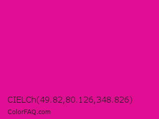 CIELCh 49.82,80.126,348.826 Color is a normal magenta color and the nearest color is Barbie Pink #e0218a. Hex code #e00e93 and RGB value is rgb(224,14,147). In RGB color space, this color is composed of 88% red, 5% green, 58% blue, In CMYK color space, this color is composed of 0% cyan, 94% magenta, 34% yellow , 12% black , In HSL color space, this color has a hue angle of 322° , 88% saturation and 47% lightness.