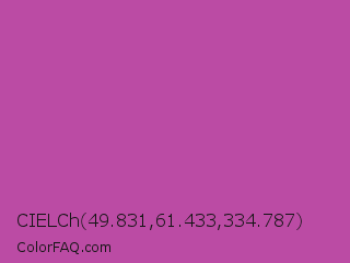 CIELCh 49.831,61.433,334.787 Color is a normal magenta color and the nearest color is Byzantine #bd33a4. Hex code #bb4ba4 and RGB value is rgb(187,75,164). In RGB color space, this color is composed of 73% red, 29% green, 64% blue, In CMYK color space, this color is composed of 0% cyan, 60% magenta, 12% yellow , 27% black , In HSL color space, this color has a hue angle of 312° , 45% saturation and 51% lightness.