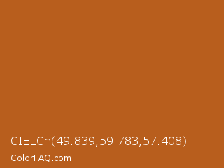 CIELCh 49.839,59.783,57.408 Color is a normal orange color and the nearest color is Light Brown #b5651d. Hex code #b85e1d and RGB value is rgb(184,94,29). In RGB color space, this color is composed of 72% red, 37% green, 11% blue, In CMYK color space, this color is composed of 0% cyan, 49% magenta, 84% yellow , 28% black , In HSL color space, this color has a hue angle of 25° , 73% saturation and 42% lightness.