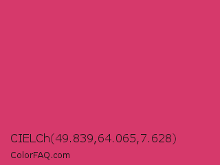 CIELCh 49.839,64.065,7.628 Color is a normal rose color and the nearest color is Cerise Red #de3163. Hex code #d6396b and RGB value is rgb(214,57,107). In RGB color space, this color is composed of 84% red, 22% green, 42% blue, In CMYK color space, this color is composed of 0% cyan, 73% magenta, 50% yellow , 16% black , In HSL color space, this color has a hue angle of 341° , 66% saturation and 53% lightness.
