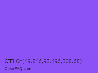 CIELCh 49.846,93.496,308.68 Color is a light violet color and the nearest color is Navy Purple #9457eb. Hex code #8d52f5 and RGB value is rgb(141,82,245). In RGB color space, this color is composed of 55% red, 32% green, 96% blue, In CMYK color space, this color is composed of 42% cyan, 67% magenta, 0% yellow , 4% black , In HSL color space, this color has a hue angle of 262° , 89% saturation and 64% lightness.