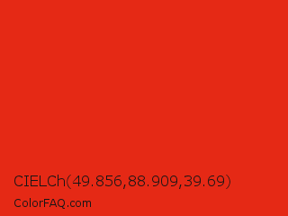 CIELCh 49.856,88.909,39.69 Color is a normal red color and the nearest color is Lust #e62020. Hex code #e52915 and RGB value is rgb(229,41,21). In RGB color space, this color is composed of 90% red, 16% green, 8% blue, In CMYK color space, this color is composed of 0% cyan, 82% magenta, 91% yellow , 10% black , In HSL color space, this color has a hue angle of 6° , 83% saturation and 49% lightness.