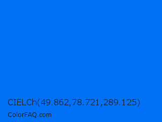 CIELCh 49.862,78.721,289.125 Color is a normal blue color and the nearest color is Brandeis Blue #0070ff. Hex code #0070f7 and RGB value is rgb(0,112,247). In RGB color space, this color is composed of 0% red, 44% green, 97% blue, In CMYK color space, this color is composed of 100% cyan, 55% magenta, 0% yellow , 3% black , In HSL color space, this color has a hue angle of 213° , 100% saturation and 48% lightness.