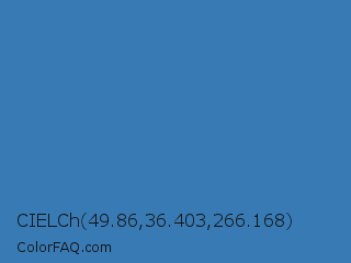 CIELCh 49.86,36.403,266.168 Color is a normal blue color and the nearest color is Steel Blue #4682b4. Hex code #387bb4 and RGB value is rgb(56,123,180). In RGB color space, this color is composed of 22% red, 48% green, 71% blue, In CMYK color space, this color is composed of 69% cyan, 32% magenta, 0% yellow , 29% black , In HSL color space, this color has a hue angle of 208° , 53% saturation and 46% lightness.