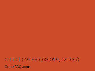 CIELCh 49.883,68.019,42.385 Color is a normal red color and the nearest color is Valencia #d84437. Hex code #ce4b2a and RGB value is rgb(206,75,42). In RGB color space, this color is composed of 81% red, 29% green, 16% blue, In CMYK color space, this color is composed of 0% cyan, 64% magenta, 80% yellow , 19% black , In HSL color space, this color has a hue angle of 12° , 66% saturation and 49% lightness.