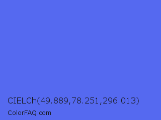 CIELCh 49.889,78.251,296.013 Color is a light blue color and the nearest color is Ultramarine Blue #4166f5. Hex code #5569f0 and RGB value is rgb(85,105,240). In RGB color space, this color is composed of 33% red, 41% green, 94% blue, In CMYK color space, this color is composed of 65% cyan, 56% magenta, 0% yellow , 6% black , In HSL color space, this color has a hue angle of 232° , 84% saturation and 64% lightness.
