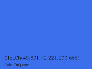 CIELCh 49.891,72.221,290.666 Color is a normal blue color and the nearest color is Royal Blue #4169e1. Hex code #3c6feb and RGB value is rgb(60,111,235). In RGB color space, this color is composed of 24% red, 44% green, 92% blue, In CMYK color space, this color is composed of 74% cyan, 53% magenta, 0% yellow , 8% black , In HSL color space, this color has a hue angle of 223° , 81% saturation and 58% lightness.