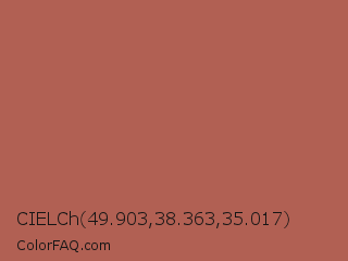 CIELCh 49.903,38.363,35.017 Color is a normal red color and the nearest color is Matrix #b05d54. Hex code #b16053 and RGB value is rgb(177,96,83). In RGB color space, this color is composed of 69% red, 38% green, 33% blue, In CMYK color space, this color is composed of 0% cyan, 46% magenta, 53% yellow , 31% black , In HSL color space, this color has a hue angle of 8° , 38% saturation and 51% lightness.