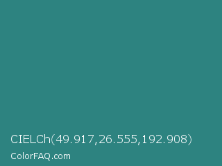 CIELCh 49.917,26.555,192.908 Color is a normal cyan color and the nearest color is Celadon Green #2f847c. Hex code #2d8380 and RGB value is rgb(45,131,128). In RGB color space, this color is composed of 18% red, 51% green, 50% blue, In CMYK color space, this color is composed of 66% cyan, 0% magenta, 2% yellow , 49% black , In HSL color space, this color has a hue angle of 178° , 49% saturation and 35% lightness.