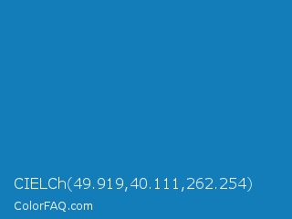 CIELCh 49.919,40.111,262.254 Color is a normal blue color and the nearest color is Cyan Cornflower Blue #188bc2. Hex code #137dba and RGB value is rgb(19,125,186). In RGB color space, this color is composed of 7% red, 49% green, 73% blue, In CMYK color space, this color is composed of 90% cyan, 33% magenta, 0% yellow , 27% black , In HSL color space, this color has a hue angle of 202° , 81% saturation and 40% lightness.