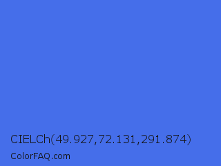 CIELCh 49.927,72.131,291.874 Color is a normal blue color and the nearest color is Royal Blue #4169e1. Hex code #456eea and RGB value is rgb(69,110,234). In RGB color space, this color is composed of 27% red, 43% green, 92% blue, In CMYK color space, this color is composed of 71% cyan, 53% magenta, 0% yellow , 8% black , In HSL color space, this color has a hue angle of 225° , 80% saturation and 59% lightness.
