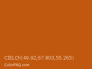 CIELCh 49.92,67.803,55.265 Color is a normal orange color and the nearest color is Orange Roughy #c45719. Hex code #c1580f and RGB value is rgb(193,88,15). In RGB color space, this color is composed of 76% red, 35% green, 6% blue, In CMYK color space, this color is composed of 0% cyan, 54% magenta, 92% yellow , 24% black , In HSL color space, this color has a hue angle of 25° , 86% saturation and 41% lightness.