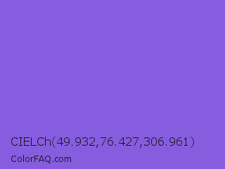 CIELCh 49.932,76.427,306.961 Color is a light indigo color and the nearest color is Navy Purple #9457eb. Hex code #875de0 and RGB value is rgb(135,93,224). In RGB color space, this color is composed of 53% red, 36% green, 88% blue, In CMYK color space, this color is composed of 40% cyan, 58% magenta, 0% yellow , 12% black , In HSL color space, this color has a hue angle of 259° , 68% saturation and 62% lightness.