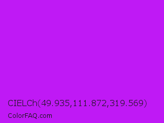 CIELCh 49.935,111.872,319.569 Color is a normal purple color and the nearest color is Vivid Mulberry #b80ce3. Hex code #bf19f5 and RGB value is rgb(191,25,245). In RGB color space, this color is composed of 75% red, 10% green, 96% blue, In CMYK color space, this color is composed of 22% cyan, 90% magenta, 0% yellow , 4% black , In HSL color space, this color has a hue angle of 285° , 92% saturation and 53% lightness.