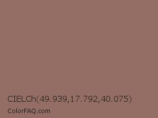 CIELCh 49.939,17.792,40.075 Color is a normal red color and the nearest color is Toast #9a6e61. Hex code #946e64 and RGB value is rgb(148,110,100). In RGB color space, this color is composed of 58% red, 43% green, 39% blue, In CMYK color space, this color is composed of 0% cyan, 26% magenta, 32% yellow , 42% black , In HSL color space, this color has a hue angle of 13° , 19% saturation and 49% lightness.