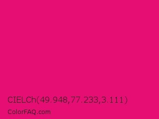 CIELCh 49.948,77.233,3.111 Color is a normal rose color and the nearest color is Red Purple #e40078. Hex code #e60e73 and RGB value is rgb(230,14,115). In RGB color space, this color is composed of 90% red, 5% green, 45% blue, In CMYK color space, this color is composed of 0% cyan, 94% magenta, 50% yellow , 10% black , In HSL color space, this color has a hue angle of 332° , 89% saturation and 48% lightness.