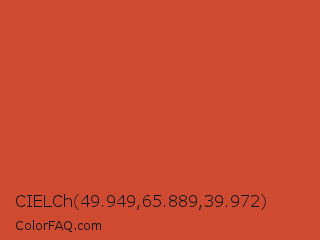 CIELCh 49.949,65.889,39.972 Color is a normal red color and the nearest color is Valencia #d84437. Hex code #ce4b31 and RGB value is rgb(206,75,49). In RGB color space, this color is composed of 81% red, 29% green, 19% blue, In CMYK color space, this color is composed of 0% cyan, 64% magenta, 76% yellow , 19% black , In HSL color space, this color has a hue angle of 10° , 62% saturation and 50% lightness.