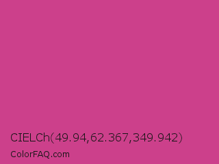 CIELCh 49.94,62.367,349.942 Color is a normal rose color and the nearest color is Smitten #c84186. Hex code #cc408b and RGB value is rgb(204,64,139). In RGB color space, this color is composed of 80% red, 25% green, 55% blue, In CMYK color space, this color is composed of 0% cyan, 69% magenta, 32% yellow , 20% black , In HSL color space, this color has a hue angle of 328° , 58% saturation and 53% lightness.