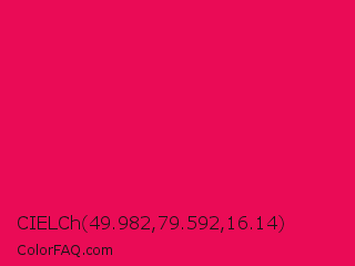CIELCh 49.982,79.592,16.14 Color is a normal rose color and the nearest color is Razzmatazz Crayola #e30b5c. Hex code #ea0b56 and RGB value is rgb(234,11,86). In RGB color space, this color is composed of 92% red, 4% green, 34% blue, In CMYK color space, this color is composed of 0% cyan, 95% magenta, 63% yellow , 8% black , In HSL color space, this color has a hue angle of 340° , 91% saturation and 48% lightness.