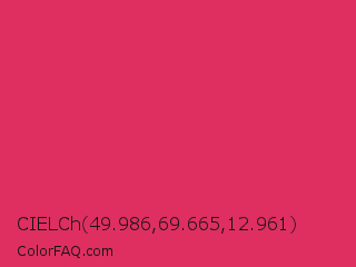 CIELCh 49.986,69.665,12.961 Color is a normal rose color and the nearest color is Cerise Red #de3163. Hex code #de2f60 and RGB value is rgb(222,47,96). In RGB color space, this color is composed of 87% red, 18% green, 38% blue, In CMYK color space, this color is composed of 0% cyan, 79% magenta, 57% yellow , 13% black , In HSL color space, this color has a hue angle of 343° , 73% saturation and 53% lightness.