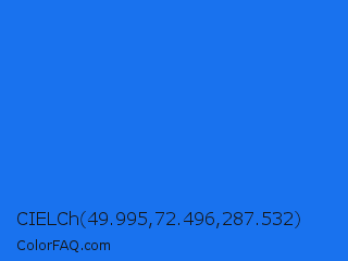 CIELCh 49.995,72.496,287.532 Color is a normal blue color and the nearest color is Blue Crayola #1f75fe. Hex code #1972ee and RGB value is rgb(25,114,238). In RGB color space, this color is composed of 10% red, 45% green, 93% blue, In CMYK color space, this color is composed of 89% cyan, 52% magenta, 0% yellow , 7% black , In HSL color space, this color has a hue angle of 215° , 86% saturation and 52% lightness.