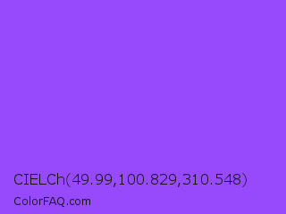 CIELCh 49.99,100.829,310.548 Color is a light violet color and the nearest color is Navy Purple #9457eb. Hex code #964afc and RGB value is rgb(150,74,252). In RGB color space, this color is composed of 59% red, 29% green, 99% blue, In CMYK color space, this color is composed of 40% cyan, 71% magenta, 0% yellow , 1% black , In HSL color space, this color has a hue angle of 266° , 97% saturation and 64% lightness.