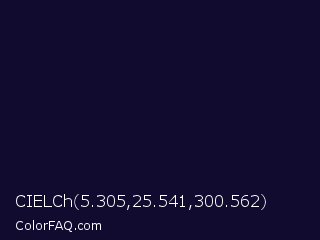 CIELCh 5.305,25.541,300.562 Color is a very dark indigo color and the nearest color is Black Rock #0d0332. Hex code #110c2f and RGB value is rgb(17,12,47). In RGB color space, this color is composed of 7% red, 5% green, 18% blue, In CMYK color space, this color is composed of 64% cyan, 74% magenta, 0% yellow , 82% black , In HSL color space, this color has a hue angle of 249° , 59% saturation and 12% lightness.