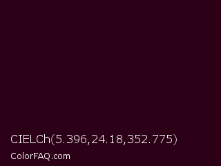 CIELCh 5.396,24.18,352.775 Color is a almost black rose color and the nearest color is Toledo #3a0020. Hex code #2c0017 and RGB value is rgb(44,0,23). In RGB color space, this color is composed of 17% red, 0% green, 9% blue, In CMYK color space, this color is composed of 0% cyan, 100% magenta, 48% yellow , 83% black , In HSL color space, this color has a hue angle of 329° , 100% saturation and 9% lightness.