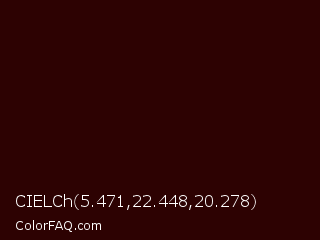 CIELCh 5.471,22.448,20.278 Color is a almost black red color and the nearest color is Sepia Black #2b0202. Hex code #2d0202 and RGB value is rgb(45,2,2). In RGB color space, this color is composed of 18% red, 1% green, 1% blue, In CMYK color space, this color is composed of 0% cyan, 96% magenta, 96% yellow , 82% black , In HSL color space, this color has a hue angle of 0° , 91% saturation and 9% lightness.