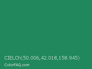 CIELCh 50.006,42.018,158.945 Color is a normal green color and the nearest color is Eucalyptus #278a5b. Hex code #21875c and RGB value is rgb(33,135,92). In RGB color space, this color is composed of 13% red, 53% green, 36% blue, In CMYK color space, this color is composed of 76% cyan, 0% magenta, 32% yellow , 47% black , In HSL color space, this color has a hue angle of 155° , 61% saturation and 33% lightness.
