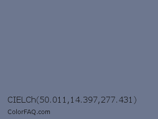 CIELCh 50.011,14.397,277.431 Color is a normal blue color and the nearest color is Raven #727b89. Hex code #6d778f and RGB value is rgb(109,119,143). In RGB color space, this color is composed of 43% red, 47% green, 56% blue, In CMYK color space, this color is composed of 24% cyan, 17% magenta, 0% yellow , 44% black , In HSL color space, this color has a hue angle of 222° , 13% saturation and 49% lightness.