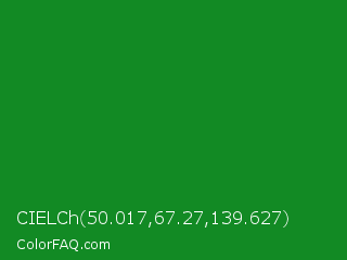 CIELCh 50.017,67.27,139.627 Color is a normal green color and the nearest color is Forest Green #228b22. Hex code #128a24 and RGB value is rgb(18,138,36). In RGB color space, this color is composed of 7% red, 54% green, 14% blue, In CMYK color space, this color is composed of 87% cyan, 0% magenta, 74% yellow , 46% black , In HSL color space, this color has a hue angle of 129° , 77% saturation and 31% lightness.