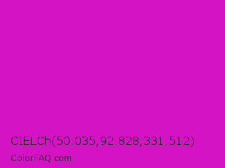 CIELCh 50.035,92.828,331.512 Color is a normal magenta color and the nearest color is Deep Magenta #cc00cc. Hex code #d413c4 and RGB value is rgb(212,19,196). In RGB color space, this color is composed of 83% red, 7% green, 77% blue, In CMYK color space, this color is composed of 0% cyan, 91% magenta, 8% yellow , 17% black , In HSL color space, this color has a hue angle of 305° , 84% saturation and 45% lightness.