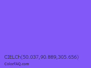CIELCh 50.037,90.889,305.656 Color is a light indigo color and the nearest color is Medium Slate Blue #7b68ee. Hex code #8059f7 and RGB value is rgb(128,89,247). In RGB color space, this color is composed of 50% red, 35% green, 97% blue, In CMYK color space, this color is composed of 48% cyan, 64% magenta, 0% yellow , 3% black , In HSL color space, this color has a hue angle of 255° , 91% saturation and 66% lightness.