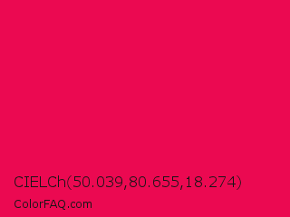 CIELCh 50.039,80.655,18.274 Color is a normal rose color and the nearest color is Razzmatazz Crayola #e30b5c. Hex code #eb0951 and RGB value is rgb(235,9,81). In RGB color space, this color is composed of 92% red, 4% green, 32% blue, In CMYK color space, this color is composed of 0% cyan, 96% magenta, 66% yellow , 8% black , In HSL color space, this color has a hue angle of 341° , 93% saturation and 48% lightness.