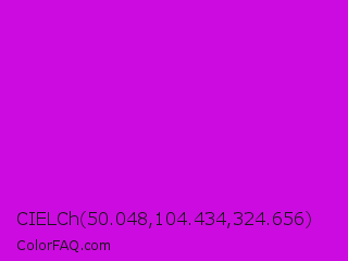 CIELCh 50.048,104.434,324.656 Color is a normal magenta color and the nearest color is Vivid Mulberry #b80ce3. Hex code #cc0be0 and RGB value is rgb(204,11,224). In RGB color space, this color is composed of 80% red, 4% green, 88% blue, In CMYK color space, this color is composed of 9% cyan, 95% magenta, 0% yellow , 12% black , In HSL color space, this color has a hue angle of 294° , 91% saturation and 46% lightness.
